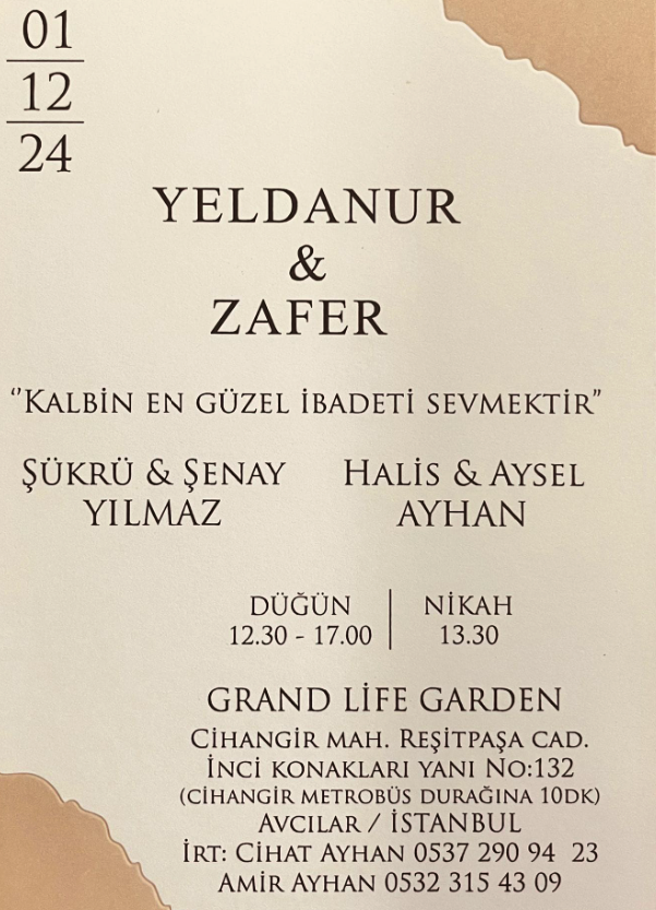 Yeldanur ve Zafer, hayatlarını birleştirmenin heyecanını sizinle paylaşmak istiyor. Düğünleri 12 Aralık'ta, Grand Life Garden'da. Davetli...
