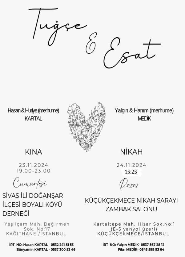 Devamını OkuSevgili dostlar, Tugçe ve Esat hayatlarını birleÅŸtirmenin heyecanını sizinle paylaÅŸmak istiyor. Kına gecesi 23 Kasım'da Sivas İli DoÄŸanÅ...