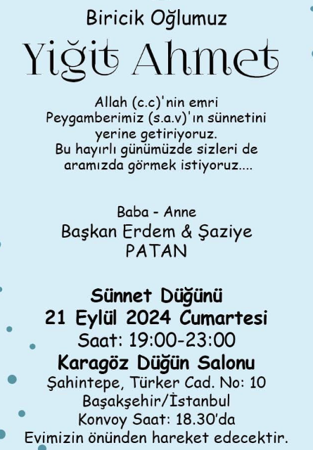 Devamını OkuSevgili dostlarımız, Yiğit Ahmet'in sünnet düğünü için sizleri 21 Eylül Cumartesi günü saat 19:00'da Karagöz Düğün Salonu'na davet ...